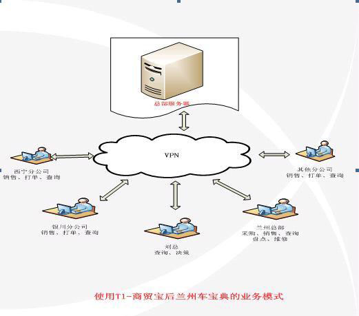 4、西寧和寧川分公司也分別安裝了T1-商貿(mào)寶客戶(hù)端,通過(guò)遠(yuǎn)程連接到總部服務(wù)器,進(jìn)行銷(xiāo)售開(kāi)單、查詢(xún)、打印等日常工作。劉總坐在蘭州的辦公室,就能實(shí)時(shí)關(guān)注分公司的業(yè)務(wù)狀態(tài)及各項(xiàng)經(jīng)營(yíng)數(shù)據(jù),根據(jù)數(shù)據(jù)的變化調(diào)整經(jīng)營(yíng)措施,必要時(shí)才出差到分公司指導(dǎo)工作。